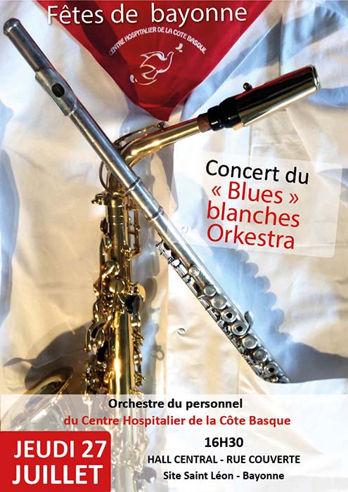 Le jeudi 27 juillet, à 16h30, le « Blues Blanches Orkestra », orchestre du personnel du CHCB , vous donne rendez-vous ainsi qu’aux patients, familles, visiteurs, à l’occasion des Fêtes de Bayonne, dans la rue couverte à Saint-Léon. Au répertoire de cette prestation : musiques variété, jazz, musiques de films mais aussi musique des Fêtes.