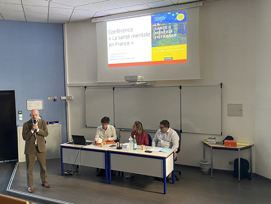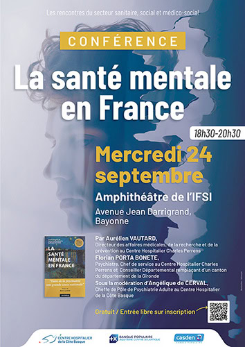 Le 24 septembre dernier à l’IFSI du Centre Hospitalier de la Côte Basque, près de 100 personnes ont assisté à la conférence sur la santé mentale, donnée par Florian PORTA BONETE, Psychiatre au CH Charles Perrens et Aurélien VAUTARD, Directeur Adjoint dans le même établissement, sous la modération d’Angélique De CERVAL, Cheffe de Pôle de Psychiatrie au CHCB.