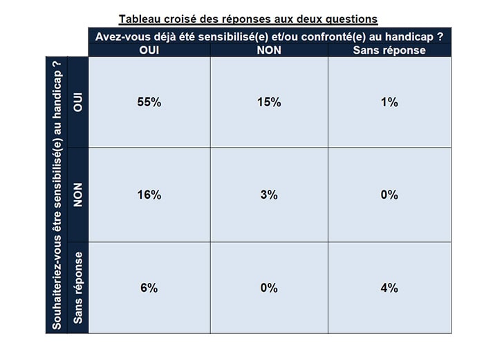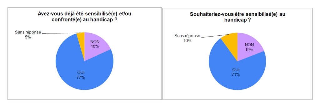 Sur 110 réponses recueillies, nous observons que 77% des répondants affirment avoir déjà été sensibilisés et/ou confrontés au handicap. Toutefois, plus de la majorité de ces agents souhaiterait à nouveau être sensibilisé. Par ailleurs, 15% des participants à cette campagne n’ont jamais été sensibilisés ni confrontés au handicap et expriment également le souhait d’être sensibilisé.