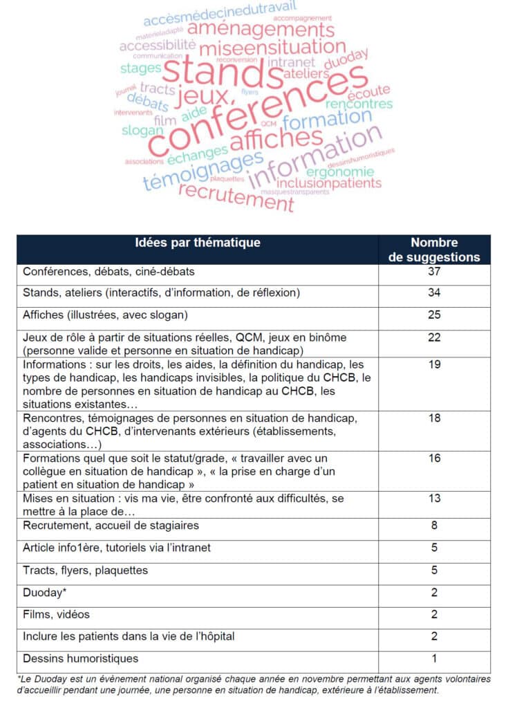La campagne sur le handicap au travail par la diffusion des boîtes à idées du 1er au 18 mars 2022, a suscité votre intérêt. Plus de 100 réponses ont été recueillies permettant de recenser de nombreuses idées d’actions de sensibilisation à mettre en place au CHCB.