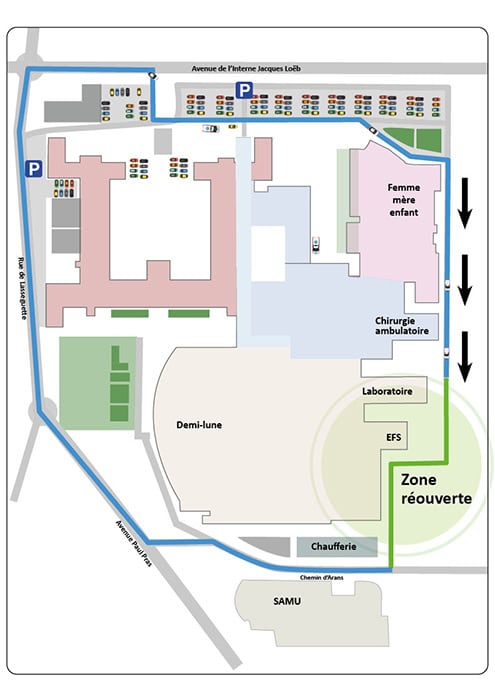 Depuis le jeudi 1er août, date de l’achèvement des travaux d’aménagement et de construction de locaux destinés à accueillir les nouveaux blocs du GCS de cardiologie, la voie de circulation située au nord du site, entre l’entrée actuelle par le chemin d’Arans et le bâtiment de la chirurgie ambulatoire, est rouverte.