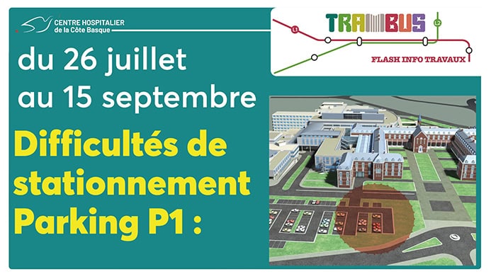Depuis le 26 juillet et jusqu’au 15 septembre, en raison des travaux liés à l’arrivée du Trambus, une petite partie du parking P1 est condamnée côté entrée principale – rue couverte. Cette occupation entraine la suppression temporaire d’une quinzaine de places de parking pour le public et est susceptible de générer des difficultés de stationnement.