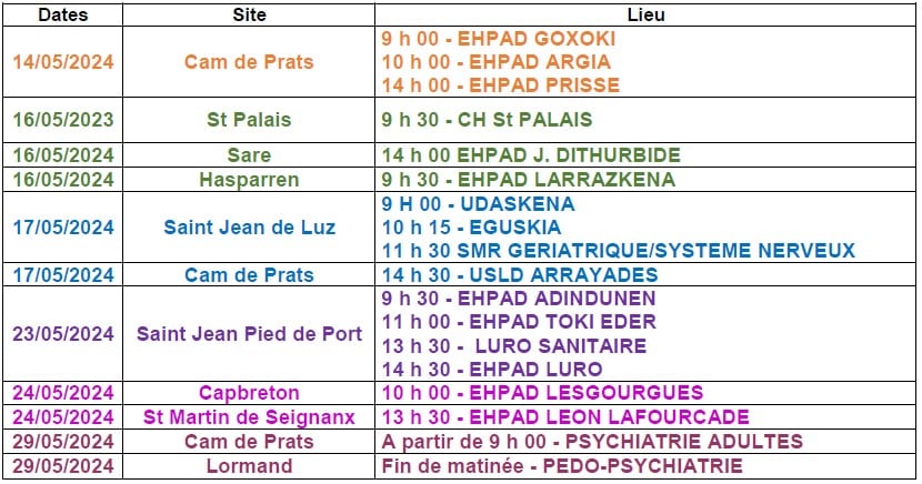 Cette action se déroulera sur l’ensemble des sites du CHCB et autres établissements de soins du G.H.T Navarre Côte Basque entre le 14 et le 29 mai .