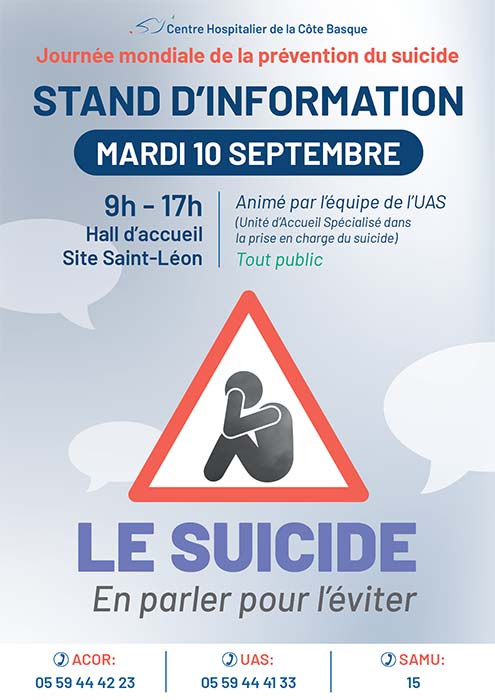A l’occasion de la Journée Mondiale de Prévention du suicide et dans le cadre de sa mission de prévention, l’Unité d’Accueil Spécialisé (UAS) du Centre Hospitalier de la Côte Basque se mobilise et propose aux patients, soignants et visiteurs un stand d’information et de prévention basé sur des animations ludiques facilitant l’échange.