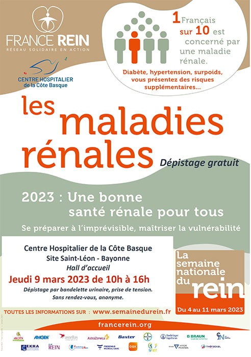 Dans le cadre de la journée mondiale du rein, une action de sensibilisation sur les maladies rénales sera proposée dans le Hall d’accueil du site Saint Léon du Centre Hospitalier de la Côte Basque le 9 mars de 10h à 16h.