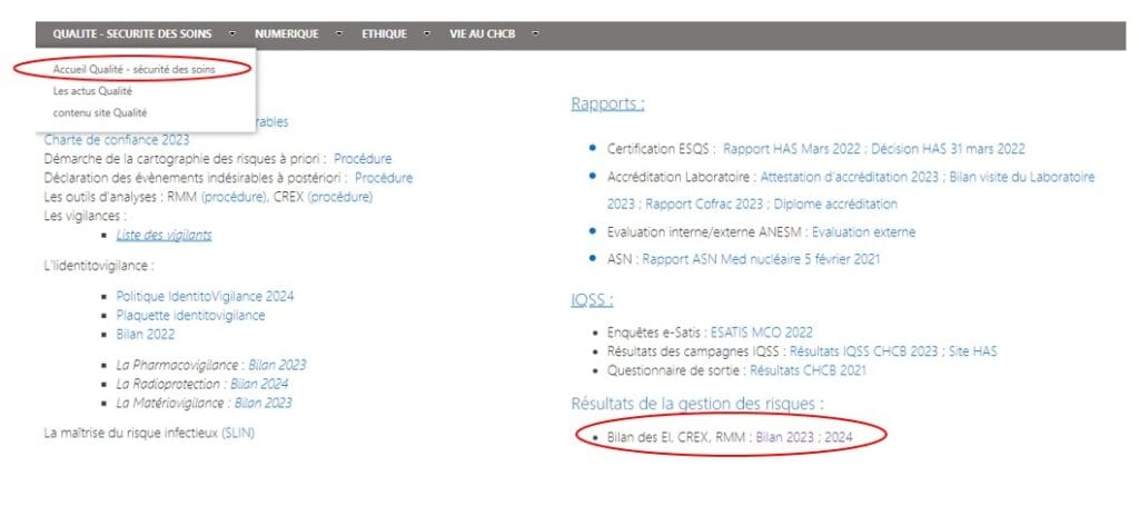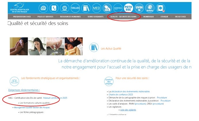 Pour les personnes n’ayant pas pu assister aux sessions du premier chapitre « Management de la Qualité », il vous est possible de visualiser la formation sur le site intranet de l’établissement. Vous pouvez y accéder en vous rendant dans l’onglet “Accueil Qualité – Sécurité des soins”.