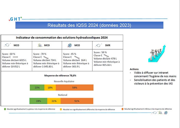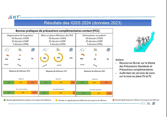 La campagne de recueil de l’indicateur qualité et sécurité des soins relatif aux DPA (précautions contact complémentaires) et ICSHA (Consommation solution hydroalcoolique) ont été communiqués en CQSS ce 10 Décembre 2024 par le Dr Bordes Couecou, responsable du SLIN.