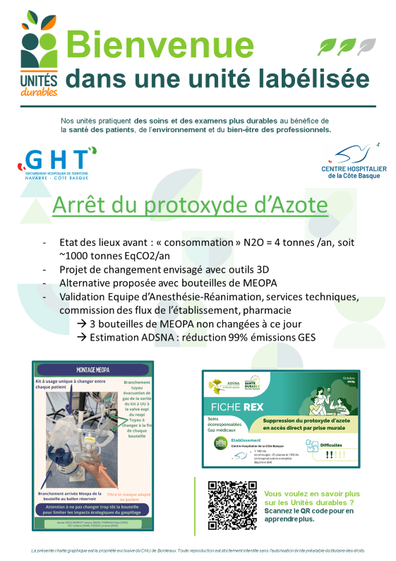 Le jeudi 20 novembre 2025, lors du colloque à Bordeaux « Ecologie et Santé – Ecosoins, réinventer l’hôpital pour une santé durable », l’équipe du bloc opératoire du Centre Hospitalier de la Côte Basque s’est vue remettre le diplôme certifiant la labellisation de ce service en tant qu’ « Unité Durable niveau 2 feuilles ».