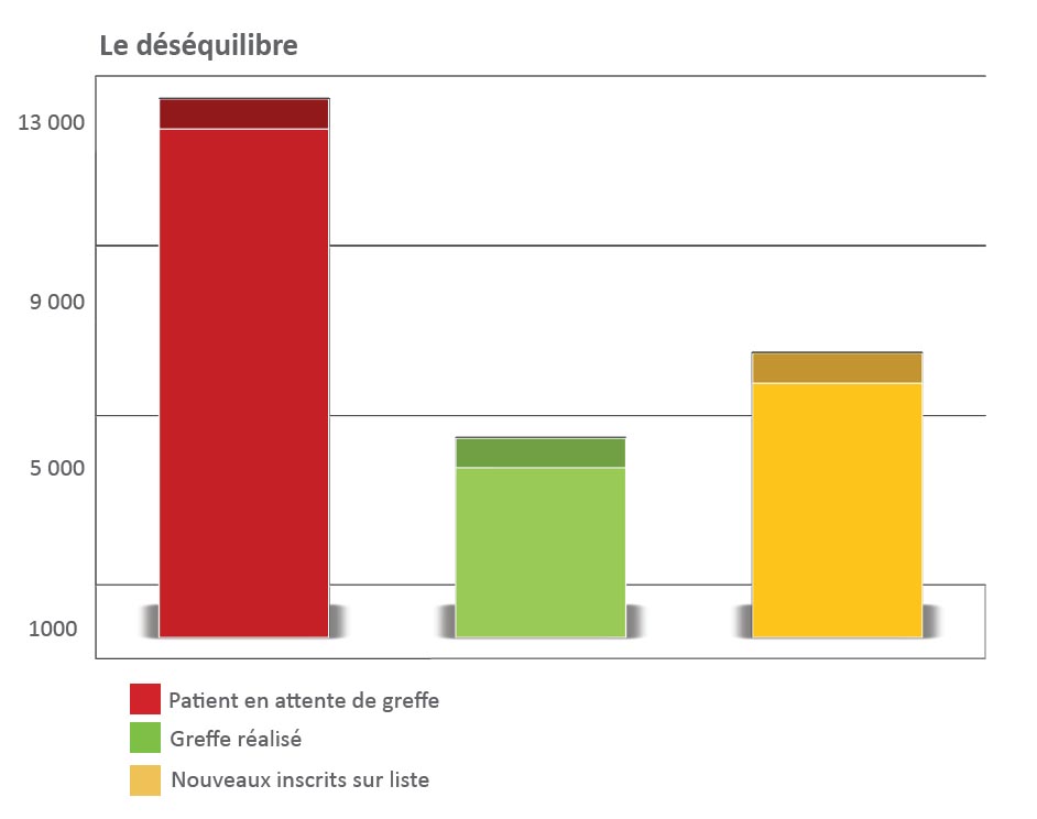 Actuellement, 13 000 patients sont en attente des greffes, tous organes confondus, 5 000 greffes sont réalisées par an et